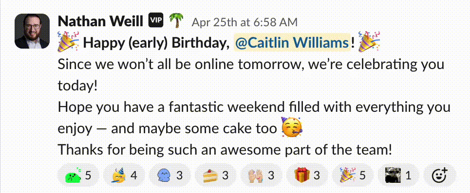 Each time we get a new client, a custom automation chooses a different fun emoji and includes it in the Slack announcement.